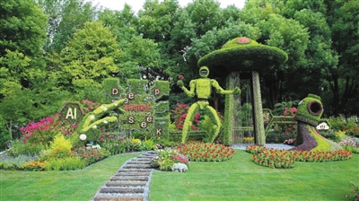 两大立体花坛一个位于金华路登云路路口,名为“智链天地”,以月球为背景,融入中国芯片、人工智能企业DeepSeek、机器人、航天器等科技元素,既时尚又充满未来感。枕木铺设的汀步融入其中,顺着花坛高低起伏的绿植层次延伸,时而穿梭于“数据链”花丛,时而环绕在“智能芯片”旁,赋予花坛强烈的沉浸感和体验感。另一个立体花坛是位于运河广场拱宸桥东岸的“月空逐梦”,它将国庆喜庆氛围与航天主题完美结合。栩栩如生的卫星模型,既展示了中国航天的辉煌成就,也传递了对未来的美好憧憬。