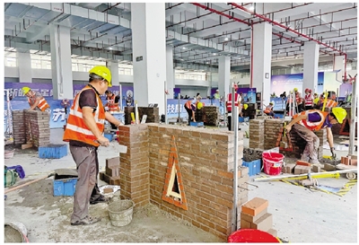 “比赛开始!”裁判员一声令下,参赛选手们快速进入竞技状态,泥瓦工(砌筑)、钢筋工、木工、水电安装工(电工)4个赛项的同步展开。