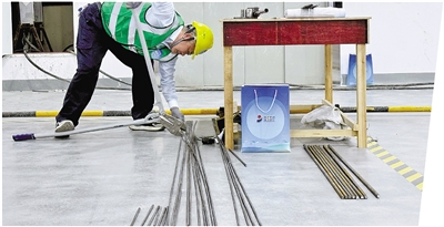 一旁的钢筋工赛项现场,杭州选手叶东水有条不紊地进行下料、切断、弯折、绑扎、固定等操作。汗珠顺着鼻尖砸在地面,他仅抬手随意抹过,视线始终紧盯作业面。