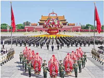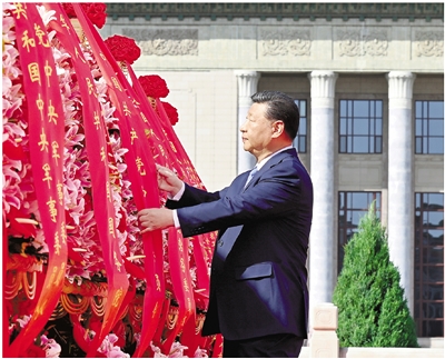 庄严的天安门广场上,鲜艳的五星红旗高高飘扬,人民英雄纪念碑巍然矗立。广场中央,“祝福祖国”巨型花篮表达着对祖国繁荣昌盛的美好祝愿。(下转第4版)