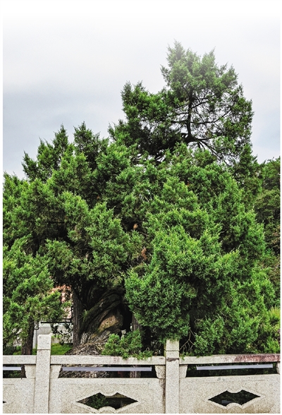 临安太湖源镇上阳村有一棵2000岁圆柏(2015年被评为杭州十大最老古树),坐落在一个用石围栏围成的大树池中。边上一块大圆石上刻着“神柏”两字,转身又见一块《千年古柏》石碑,字迹虽然有些模糊,仍可读出文字,“世界上罕见的奇树,树龄约2000年。树高8米,胸围198厘米,树冠6米。集圆、扁、刺三叶于一体,堪称奇迹。”