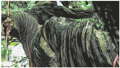 这“神”“奇”之树并不特别高大。整棵古树向西倾斜,主干直到树梢树纹均呈螺旋状扭转,仿佛一档一档的螺旋扶梯,古树的西侧有一根大枝,先是旋转着平伸,后又旋转着微微翘起,像一把太师椅。