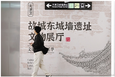 近日,位于天津地铁4号线东南角站的天津卫故城东城墙遗址文物展厅正式开放,展厅内21米长的城墙遗址层次分明,让乘客在出行时也能了解天津历史。