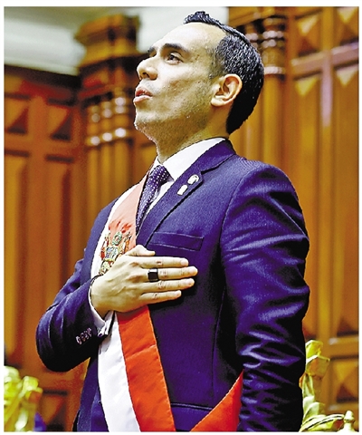 10月10日,在秘鲁首都利马,秘鲁国会主席何塞·耶里宣誓就任总统后唱秘鲁国歌。