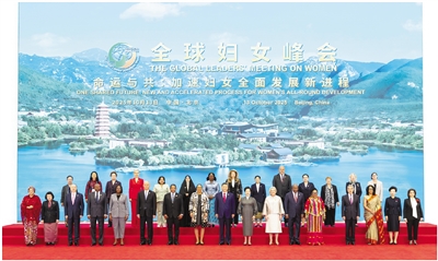 10月13日上午,国家主席习近平在北京国家会议中心出席全球妇女峰会开幕式并发表主旨讲话。这是习近平和夫人彭丽媛同与会各国和国际组织代表团团长夫妇合影留念。 新华社记者 黄敬文 摄
