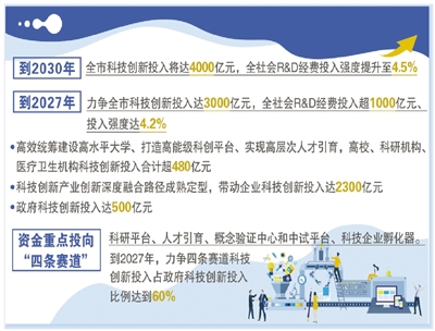 创新活力之城的持续进位,离不开科技创新的持续投入。《方案》构建了阶梯式发展目标:到2027年,科技创新投入机制更加健全,力争全市科技创新投入达3000亿元,全社会R&D经费投入超1000亿元、投入强度达4.2%。高效统筹建设高水平大学、打造高能级科创平台、实现高层次人才引育,高校、科研机构、医疗卫生机构科技创新投入合计超480亿元;科技创新产业创新深度融合路径成熟定型,带动企业科技创新投入达2300亿元;科技创新投入牵动的创新环境持续优化。政府科技创新投入达500亿元,投入效能不断提升,形成良好创新生态。