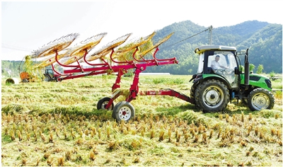 10月16日,第45个世界粮食日。在位于建德市钦堂乡的杭州心之所向农创文旅有限公司里,农技员驾驶着新配置的搂草机、抓草机和打捆机,在已经完成收割的稻田里玩起了“杂耍”,灵巧的农机装备分工协作,高效地将散落田间的秸秆搂集绞条、编织成毯、压实打捆后,统一装运离田,回收加工成饲料、肥料、燃料等。据了解,该公司添置的这批新型农机不仅用于公司承包田,还为全市6个镇街的种植户开展免费的秸秆回收利用服务。