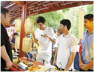 中外游客在满觉陇赏桂非遗市集品味美食、参与互动。