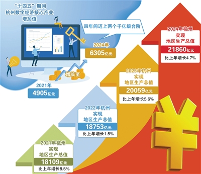 数字经济是杭州的一张“金名片”。“十四五”期间,杭州数字经济核心产业增加值从2021年的4905亿元增长至2024年的6305亿元,4年间迈上两个千亿级台阶。