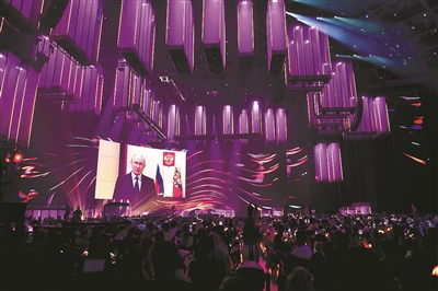 日前,在莫斯科,俄罗斯总统普京向“国际视界”音乐大赛发表视频致辞。新华社发(亚历山大 摄)