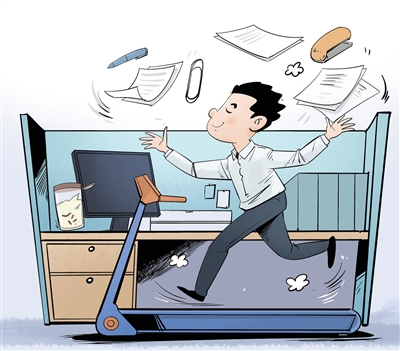 在跑步机上挥汗如雨、气喘吁吁过后,却发现只是在原地踏步。新华社记者调研发现,在基层,一些单位出现“跑步机现象”。一些干部在参与改革工作时原地踏步、自说自话。看似忙忙碌碌,实则建树寥寥。有的干部把简单任务复杂化,一份仅需半天完成的工作,却要分成三天来完成。有的干部专注于“务虚”,心思用在表面文章上,对事关民生的实事却疲于应付,还有的干部自身能力不足,以假忙碌掩盖自己业绩平淡的问题。 漫画 勾犇