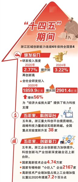 据介绍,“十四五”期间,浙江区域创新能力连续4年保持全国第4,研发投入强度从2020年的2.77%提升到2024年的3.22%、再创新高,全社会研发投入从2020年的1859.9亿元增长到2901.4亿元、增长56%,为“经济大省挑大梁”提供了有力科技支撑。