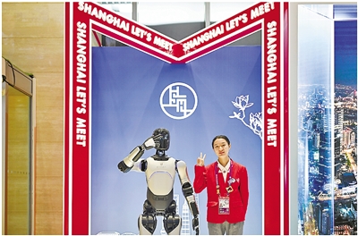 11月4日,志愿者(右)在第八届进博会新闻中心与“机器人志愿者”合影。第八届中国国际进口博览会将于11月5日至10日在上海举行。目前,各项工作准备就绪,静待盛会开幕。