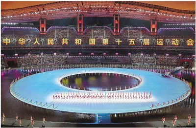 这是11月9日拍摄的开幕式现场。 当日,第十五届全国运动会开幕式在广东奥林匹克体育中心举行。 新华社记者 卢汉欣 摄