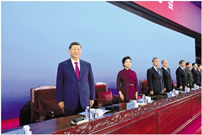 入场仪式完毕,全场起立,高唱中华人民共和国国歌。在雄壮的国歌声中,五星红旗冉冉升起、高高飘扬。(下转第2版)