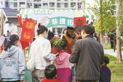 汇演开始前,广场化身充满烟火气的“幸福小集市”。非遗糖画、指尖编织、巧手面塑等摊位前围满了住户,孩子们的欢笑、邻里间的交谈与非遗手艺人的讲解声交织,构成一幅其乐融融的社区画卷。