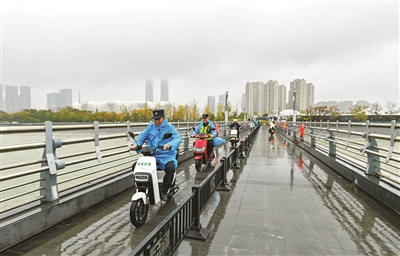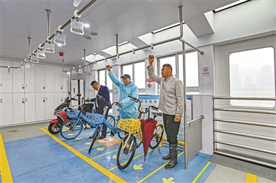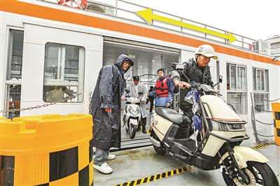 如果不赶时间,也可以排队等候轮渡。据介绍,运营初期,渡口日常配备三艘轮渡,每艘可载运50辆非机动车。两岸码头处均设有宽敞的等候区,北岸可容纳近300辆,南岸可容纳约150辆,并有引导员保障现场秩序。