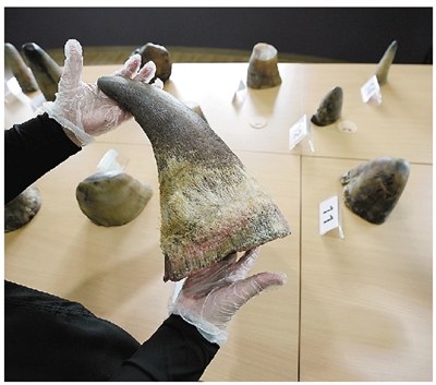 图为11月18日,一名国家公园局工作人员在新加坡野生动植物法证中心向媒体展示查获的犀牛角。新加坡国家公园局当天发布公告称,新加坡查获迄今为止最大宗的犀牛角走私案,共发现20支、总重35.7公斤的犀牛角。