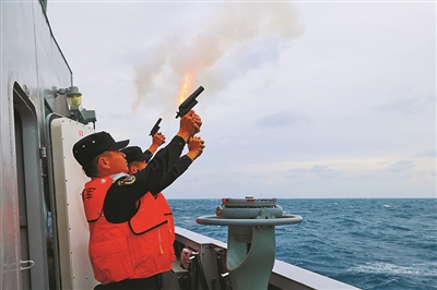 11月20日,中越联合巡逻舰艇编队开展联合搜救演练,中方任务官兵发射信号弹。 新华社发(李正嵩 摄)