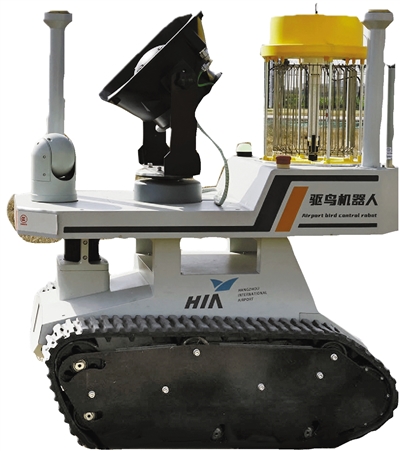 在杭州机场的跑道边,一台履带式机器人在草坪上缓缓移动,它沿着预设路线巡检,不断发出猛禽的叫声……