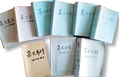 我的藏书里还有长期订阅的《杂文报》和《杂文月刊》。前者是杂文类报纸,后者是杂志。两者陪伴我多年,是唯二看完后被精心装订起来的,下针、穿线、装封,可谓“慈母手中线”的再现。甚至还买了毛笔和墨汁,把自己不怎么优秀的字题上。我刊发的数百篇杂文,就是靠着这些书的滋养。