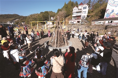 正午时分,农产品集市与畲族民俗体验区成为焦点。村民自家种植的果蔬、手工制作的畲族乌米饭等特产吸引游客纷纷选购,全天销售额近2000元,切实拓宽了村民增收渠道。一旁的民俗体验区更是热闹非凡,竹竿舞、打麻糍、彩带编织等活动让游客亲身感受畲族文化,“小热昏”说唱引来阵阵欢笑,传统技艺在互动中薪火相传。