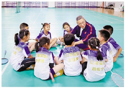 学校羽毛球馆内,金晓东和学生围坐一起聊运动。学校供图