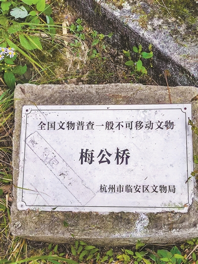读罢简短文字,虽知道“桥”和“电”是梅兰芳所行的善事,但究其缘由,则一无所知。忽见桥头有块1米多高、50多厘米宽、刻有“重修”二字的石碑,内中文字已漫漶不清,几成“无字碑”。但在模糊的碑文中,我用水一泼,却隐隐约约地显露出“陆佰”两字。于是我猜想,这莫非是梅兰芳所捐赠修桥银圆的数目?再低头一看,桥头地上粘贴着一块约长50厘米、宽40厘米的铝牌,上有“梅公桥”“临安区文物局全国文物普查中,列为一般不可移动文物”。原来这座“梅公桥”已成为地方上的文物了!