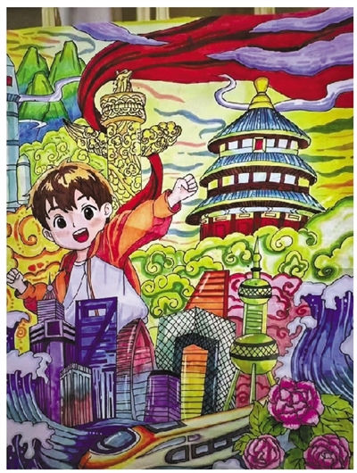 画画是我记录生活的方式。高兴时,我会画下公园里挺拔的大树、灿烂的阳光,让景色组成一条漂亮的弧线;难过时,我便让大雨无情地落下,就像我的泪水如洪水般倾泻。通过画笔,我能让花儿绽放笑容,让太阳流下眼泪,能画出一锅热气腾腾的汤圆,仿佛成了掌控世界的小魔法师,这种自由表达的感觉让我深深着迷。在画画时,我会全身心投入。记得有一次我画“孙悟空”,为了画好一只手,我忘记了吃饭时间,直到自己满意才放下画笔。这种专注和坚持让我体会到绘画的魅力。从简单的涂鸦到复杂的风景画,我渐渐明白了持之以恒的重要性。
