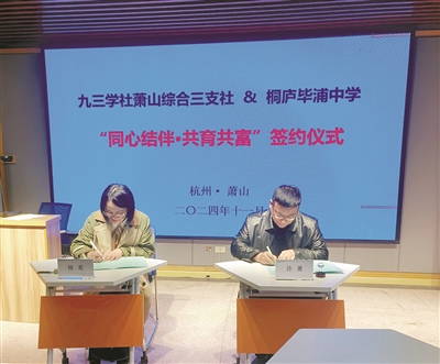 图②:九三学社萧山综合三支社与桐庐县毕浦中学签署《“同心结伴 共育共富”三年行动协议》,设立“名誉校长”工作坊。