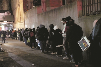 17日,在美国纽约曼哈顿的一处救助点,数百人排队等待领取一份免费晚餐。 据新华社消息