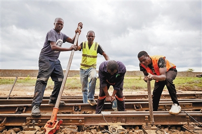 在赞比亚中央省的新卡皮里姆波希车站轨道上,工人们用套筒扳手、撬棍等工具,将一颗颗钢轨扣件、道钉卸下,移开铁轨,工程师斯坦利·西穆希告诉记者:“我们正在给站内一段轨道更换新的枕木。”