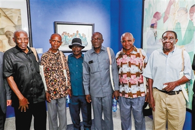 11月26日,在坦桑尼亚达累斯萨拉姆,坦赞铁路退休职工在“同路朋友——坦赞铁路采风绘画展”上合影。新华社发(赫尔曼·埃马纽埃尔 摄)