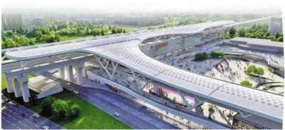 杭州机场高铁海宁观潮站鸟瞰效果图。