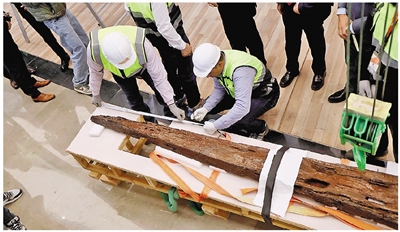 图为12月23日,在埃及吉萨的大埃及博物馆胡夫太阳船展厅内,埃及修复团队启动古埃及法老胡夫第二艘太阳船的组装工作。