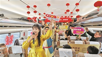 左上图为12月26日,在西安北站,一名乘客在西延高铁首发C9312次列车前庆祝。右上图为演员当天在延安开往西安的首发列车上表演节目。