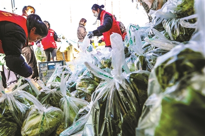 志愿者在帮助王为杰(左)收菜。通讯员 白羽 摄