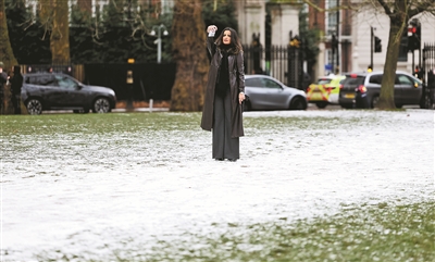 图为1月6日,在英国伦敦,一名女子在雪地上自拍。英国气象局称,受北极寒流影响,该国寒冷天气持续,并伴有降雪、雨夹雪和冰雹。 新华社记者 李颖 摄