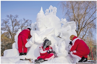 1月8日是“三九”首日,为期4天的第28届中国·哈尔滨国际雪雕比赛在严寒中进入第三天,雪雕作品显露芳容。图为在比赛现场,选手进行雪雕创作。新华社记者 王建威 摄