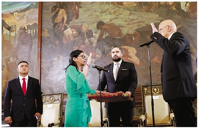 图为委内瑞拉代理总统德尔西·罗德里格斯5日宣誓就任该国临时总统。罗德里格斯7日说,委内瑞拉对“能使各方受益”的能源关系持开放态度。