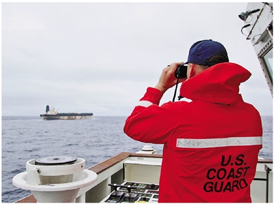 这张美国欧洲司令部1月7日发布在社交媒体上的照片显示,一名美国海岸警卫队官员使用望远镜查看“贝拉1”号油轮。新华社/路透