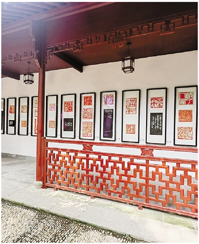 印人印廊静静依在柏堂之西。它原本只是一堵围墙,直到1998年,西泠印社建社九十五周年的那个秋天,才被赋予廊的形态——单坡屋面下,朱红的廊柱托起一檐荫凉。缓步其间,目光拂过玻璃罩下的一方方印蜕,文彭、何震、丁敬、吴昌硕、齐白石……从明清至现代,四十余人的气息凝于石上。朱红的印面与墨黑的边款,在刻石与拓片上静静对话。这些印人,大多不独以篆刻闻名,他们的书法、诗文、绘画造诣,也早已汇入更宽广的历史文化长河中。此处,只有方寸金石间留下的刀痕笔意,如雪泥鸿爪,展示着他们曾如何以铁笔叩开金石的心扉。廊南墙上,一块乾隆年间的《重浚西湖并复柏堂竹阁记》石碑,字迹已有些漫漶,它比长廊本身更加古老,见证着此地过去的岁月。