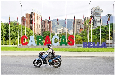 1月13日,在加拉加斯,摩托车行驶在大街上。新华社记者 丁洪法 摄