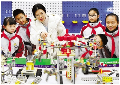 1月15日,在建德市寿昌第一小学的人工智能AI工坊教室里,指导老师正在为科技社团的学生们讲解旋转木马、摩天轮等拼搭机器人的运转原理及编程要领。据了解,该校通过引进AI机器人项目的少儿编程教学课程,组织学生参与培训、实践和比赛,从小点燃科技梦想。