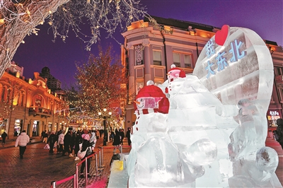入冬以来,哈尔滨的百年老街中央大街增添了数十个冰雕景观,把中央大街装饰得流光溢彩,吸引众多市民和游客游览参观。