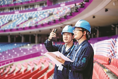 来涵斌(右)和同事在杭州奥体中心为杭州亚运会保电。姚靖霖 摄