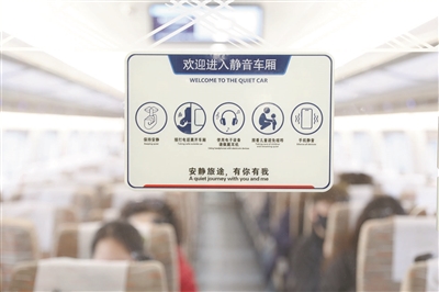图为1月27日在G6686次列车“静音车厢”拍摄的“静音车厢”标识。2月1日起,“静音车厢”服务将拓展至除动卧列车之外的“D”字头、“G”字头动力分散动车组列车,届时全国铁路提供“静音车厢”服务的列车将增至超8000列。 新华社发(祝庆 摄)
