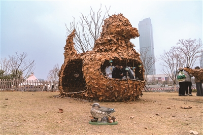 该艺术装置以自然落叶为素材,巧妙构筑出“鸳鸯”飞翔与栖居的意象,形成一个可供公众步入、互动的“可呼吸的生命体”,内部悬挂着由中国美术学院“艺梦童行”公益小组与杭州市笕桥中学学生共同制作的低温陶艺鸳鸯,营造出观创一体的沉浸式体验。