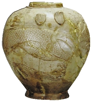 ② 钱元瓘墓出土 双龙纹秘色瓷罂 (浙江省博物馆藏)