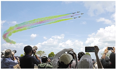图为2月3日,中国空军八一飞行表演队在第十届新加坡航展首日进行飞行表演。